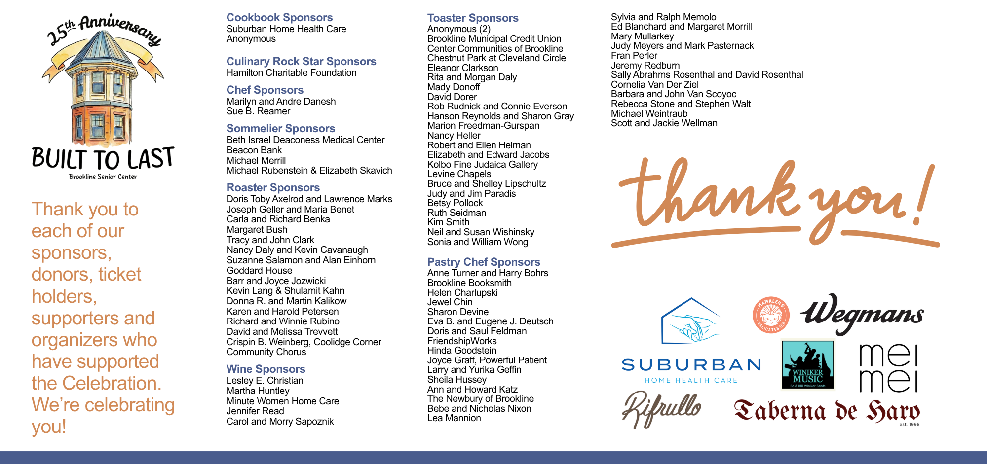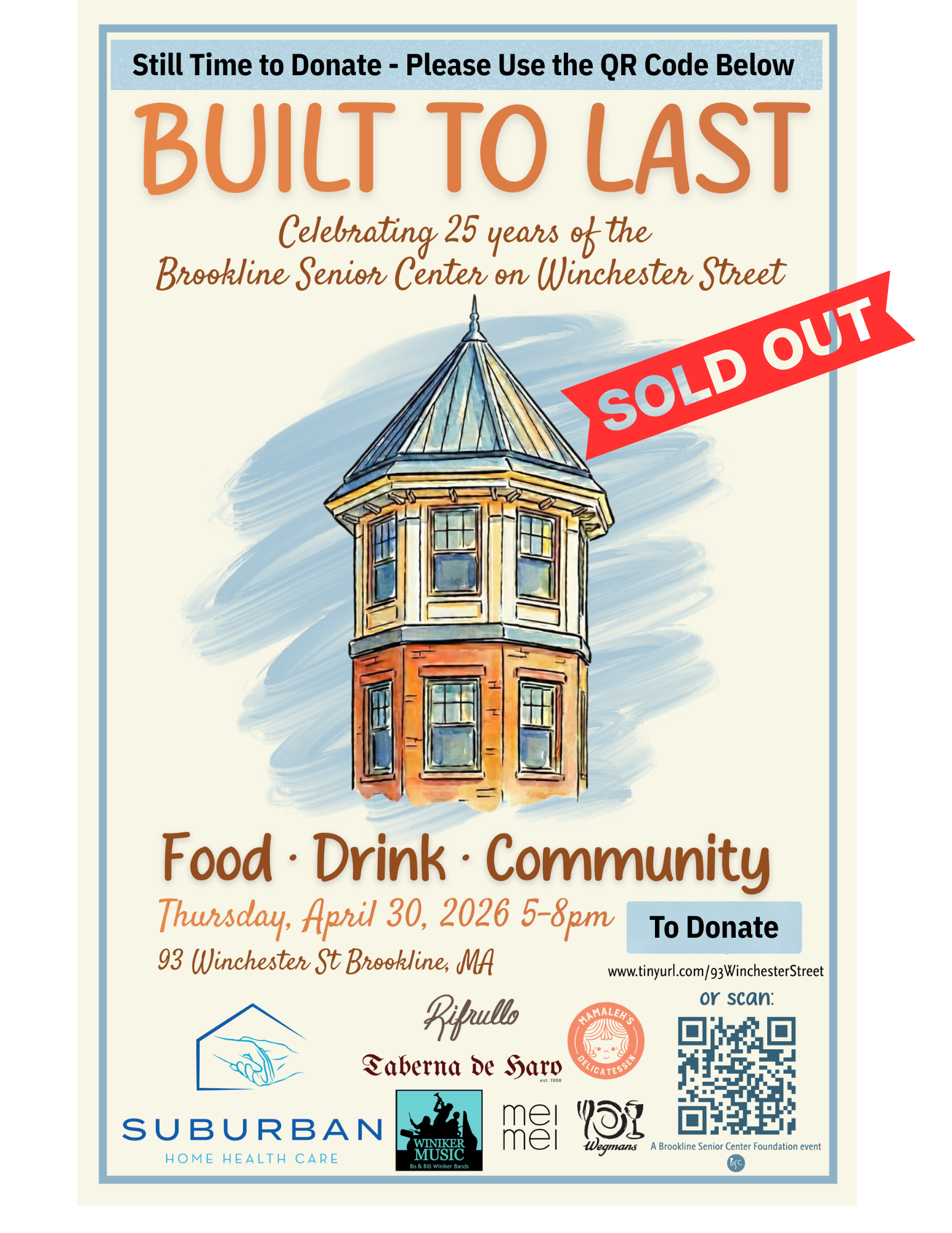 For 25 years the Brookline Senior Center has offered opportunities for older adults to participate in a variety of programs, make new friends, volunteer, and access vital services. The Brookline Senior Center Foundation looks forward to hosting, “Built to Last – 25 Years on Winchester Street!”